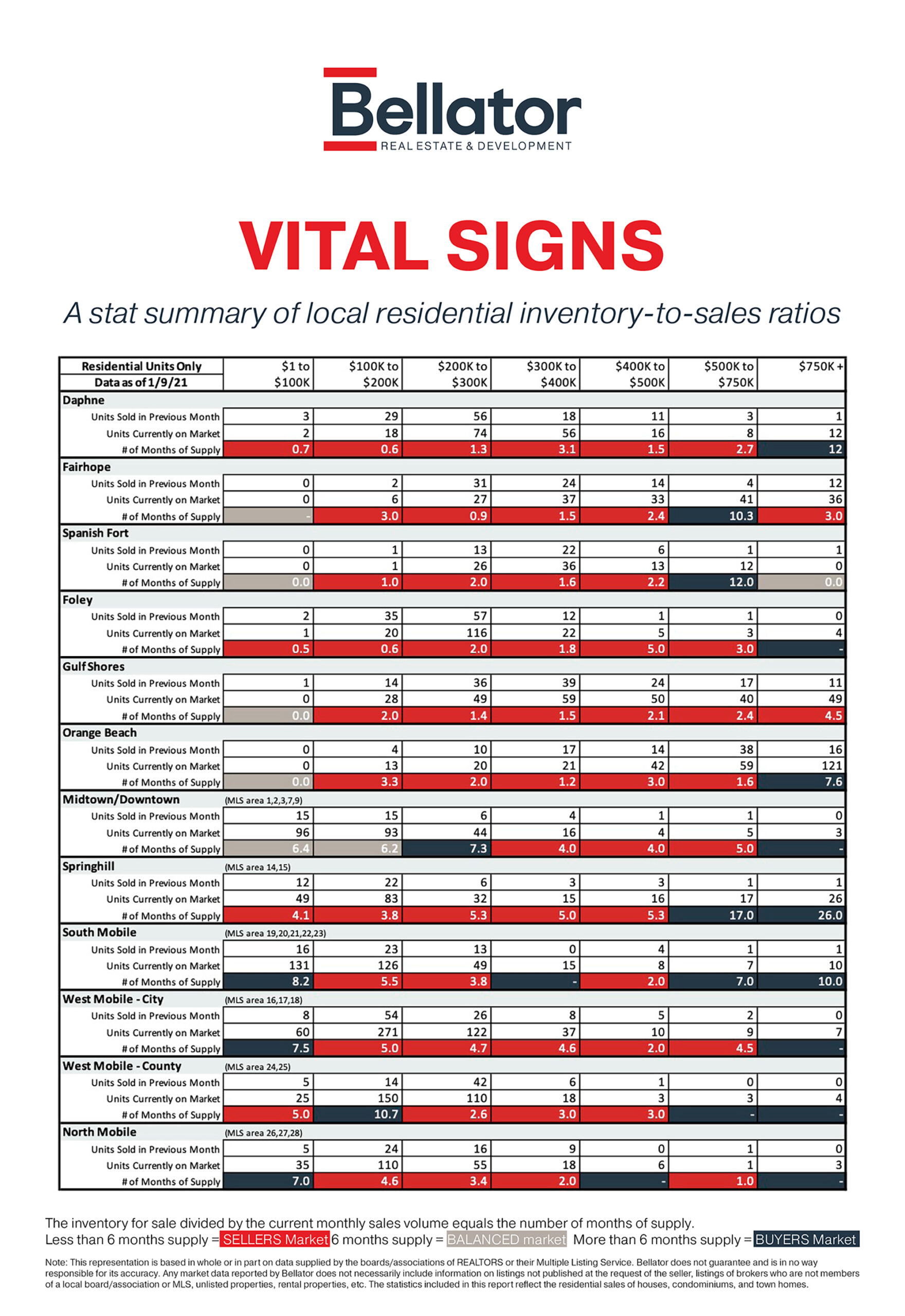 Alabama's Gulf Coast contains several real estate markets depending on location and price point – just to name a few factors. The graphic below shows real estate statistics for December 2020, the latest month available.