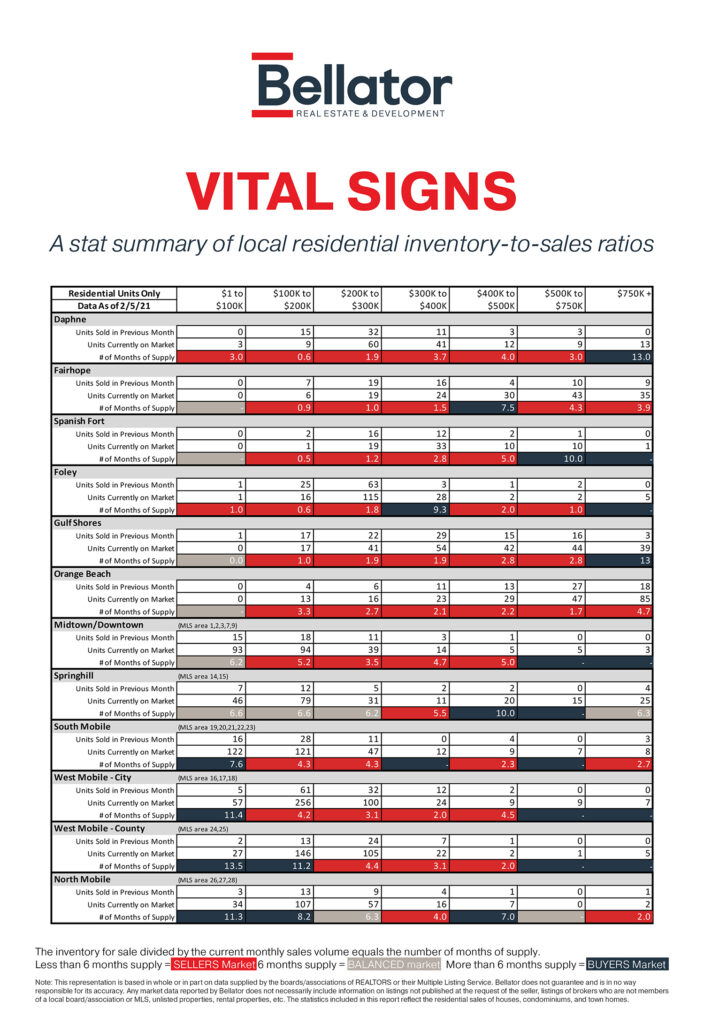 Alabama's Gulf Coast contains several real estate markets depending on location and price point – just to name a few factors. The graphic below shows real estate statistics for January 2021, the latest month available.