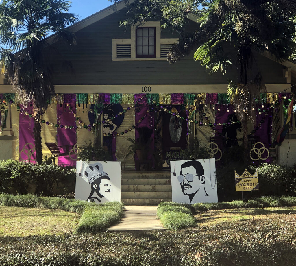 No, that isn't a typo. Since Mardi Gras parades are apparently so last year, our neighbors have gotten inventive, decorating their yards and porches with Mardi Gras decorations that can be enjoyed safely from the comfort of your car – or on a walk around the neighborhood.