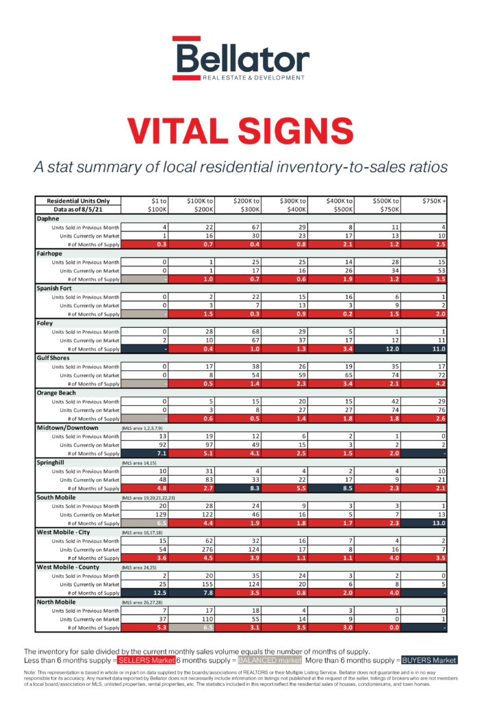 Alabama's Gulf Coast contains several real estate markets depending on location and price point – just to name a few factors. The graphic below shows real estate statistics for July 2021, the latest month available.