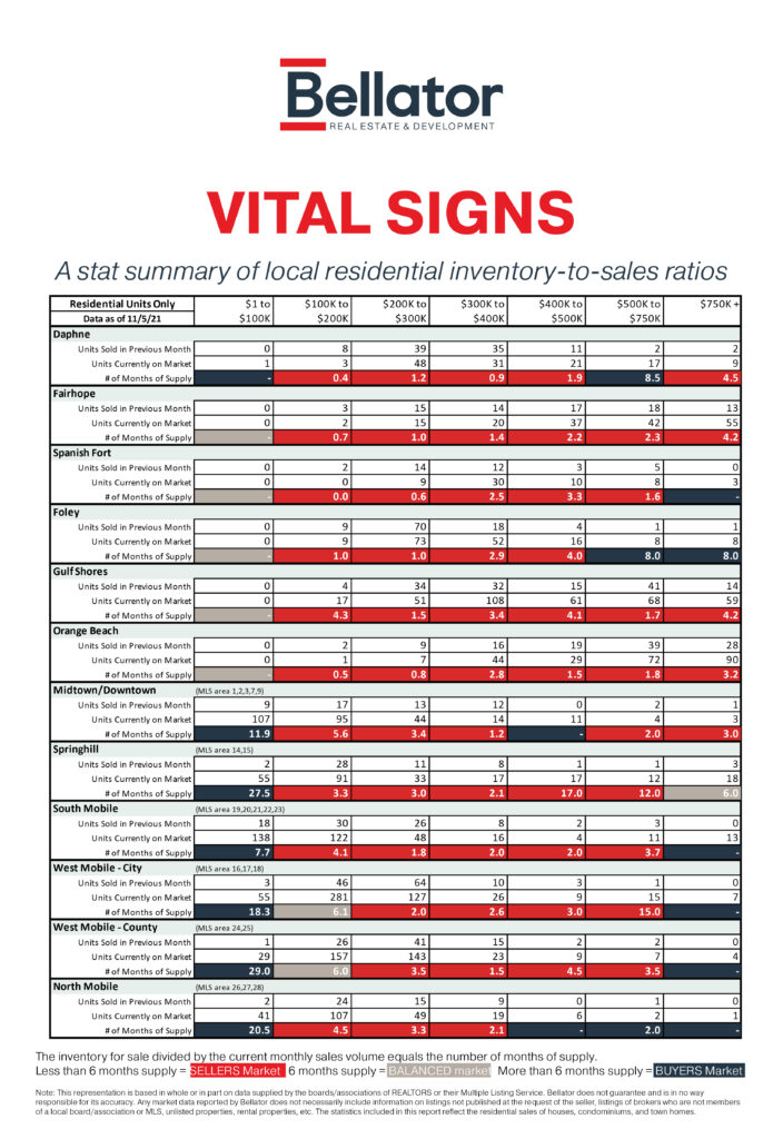 Alabama's Gulf Coast contains several real estate markets depending on location and price point – just to name a few factors. The graphic below shows real estate statistics for October 2021, the latest month available.