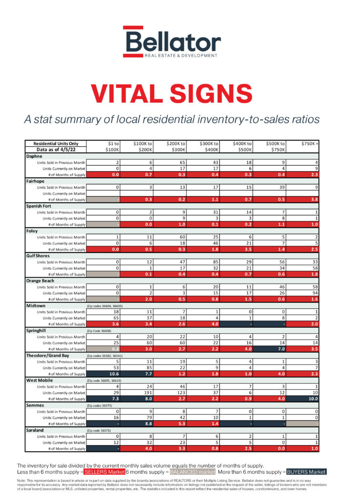 Alabama's Gulf Coast contains several real estate markets depending on location and price point – just to name a few factors. The graphic below shows real estate statistics for March 2022, the latest month available.