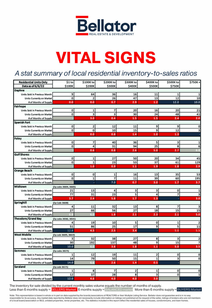 Alabama's Gulf Coast contains several real estate markets depending on location and price point – just to name a few factors. The graphic below shows real estate statistics for May 2022, the latest month available.