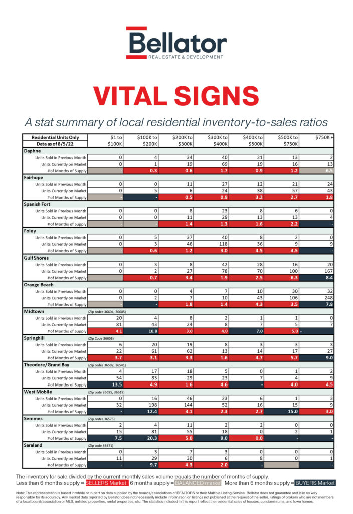 Alabama's Gulf Coast contains several real estate markets depending on location and price point – just to name a few factors. The graphic below shows real estate statistics for July 2022, the latest month available.