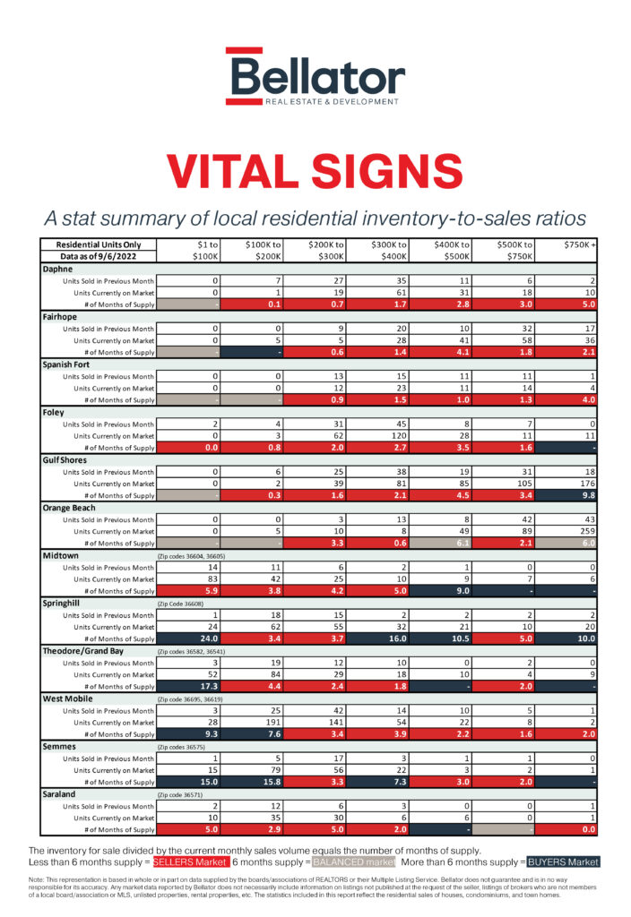 Alabama's Gulf Coast contains several real estate markets depending on location and price point – just to name a few factors. The graphic below shows real estate statistics for August 2022, the latest month available.
