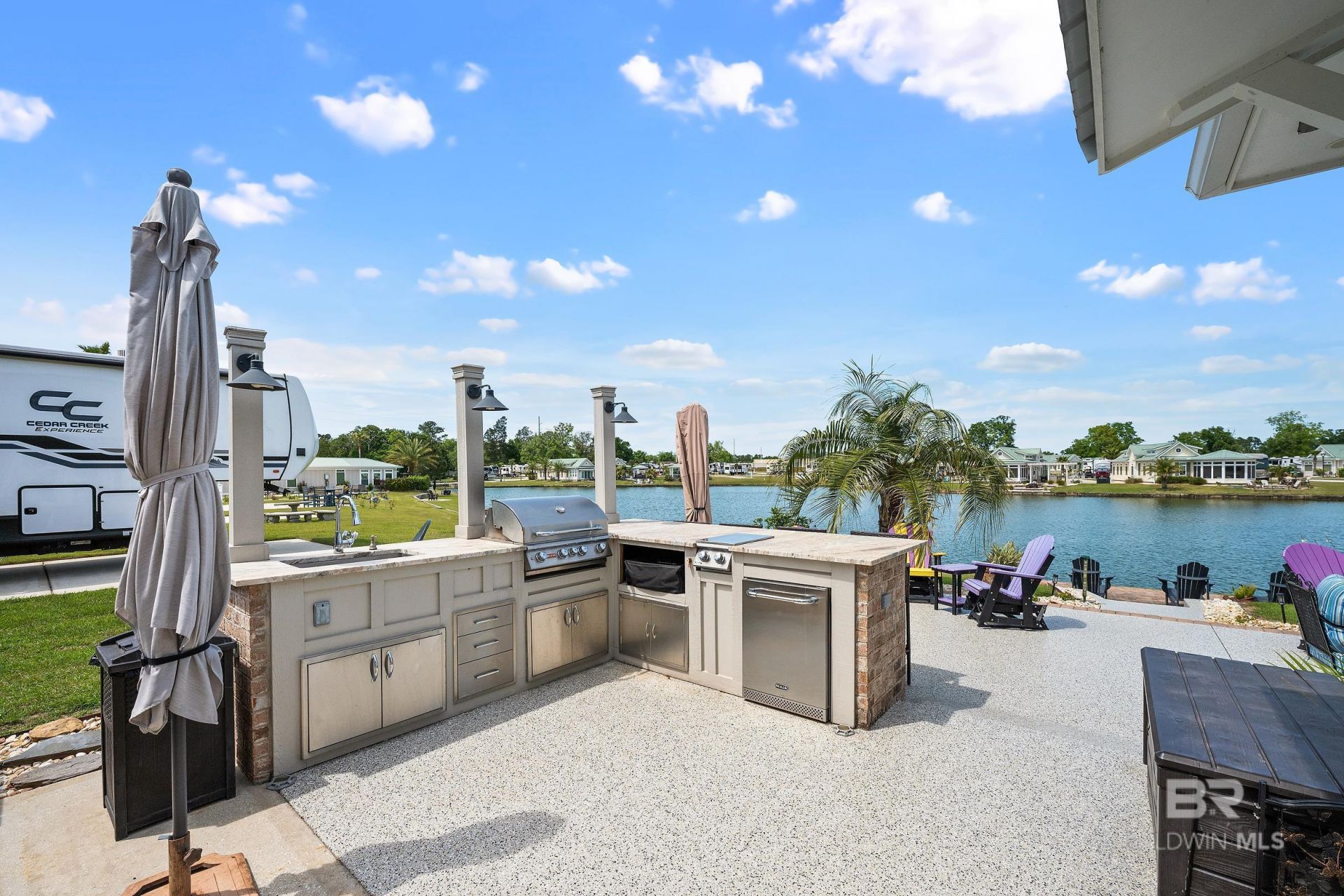 A must see home in Lake Osprey RV Country Club, Elberta, AL, offering a functional and low-maintenance lifestyle. The open-concept interior features tray ceilings, abundant natural light, and a spacious living area. The kitchen includes a large island, granite countertops, double oven, microwave, gas stove top, side by side fridge, dishwasher, ample cabinet space, and a walk-in pantry. The primary suite offers a double vanity, and tiled walk-in shower. Additional highlights include half bath, a built-in desk/work area, laundry room, and whole house water softer.Outdoor living is enhanced with multiple seating areas, a built-in bar and kitchen, and a gas firepit for entertaining or relaxing. This property is suitable for full-time residence or seasonal use. Home warranty in value of $500 is being offered by the seller for an extra piece of mind. Conveniently located near Foley, Gulf Shores, and Orange Beach with access to shopping, dining, and coastal attractions. Community restrictions apply for RV year, class, and size. HOA dues of $320/month include water, sewer, trash, cable TV, and lawn care. Amenities include a remodeled clubhouse, infinity-edge pool and hot tub, fitness center, laundry facility, pickleball courts, putting green, tiki bar, grilling areas, walking trails, lake access, and fenced dog park. Conveniently located near Gulf Coast beaches, shopping, dining, golf, and regional airports. Buyer to verify all information during due diligence.