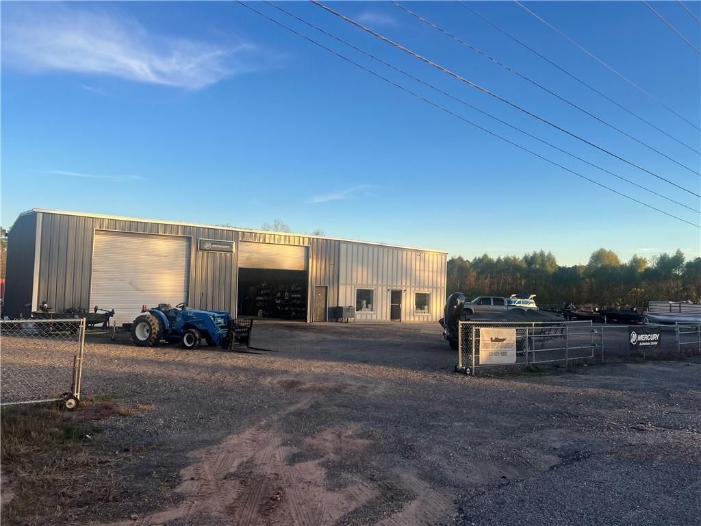 Location! Location! Location! Approx. 3200 sq.ft. building on two lots totaling approximately. 2.68 acres near the intersection of Highway 43 & Highway 158. Currently being used as a marine business and repair shop but endless possibilities for a garage shop, machine shop, tire shop, trucking company, boating storage or sales shop, etc... Several offices are available with 5 rooms above the shop on the second level and a separate large office and sales area on bottom floor. 2.5 baths. The open work area has 3 garage doors with 14 ft. height. Updated within the past 4 years: new roof, 3 sides with new siding, partially new fence to enclose half of the property, new gates.