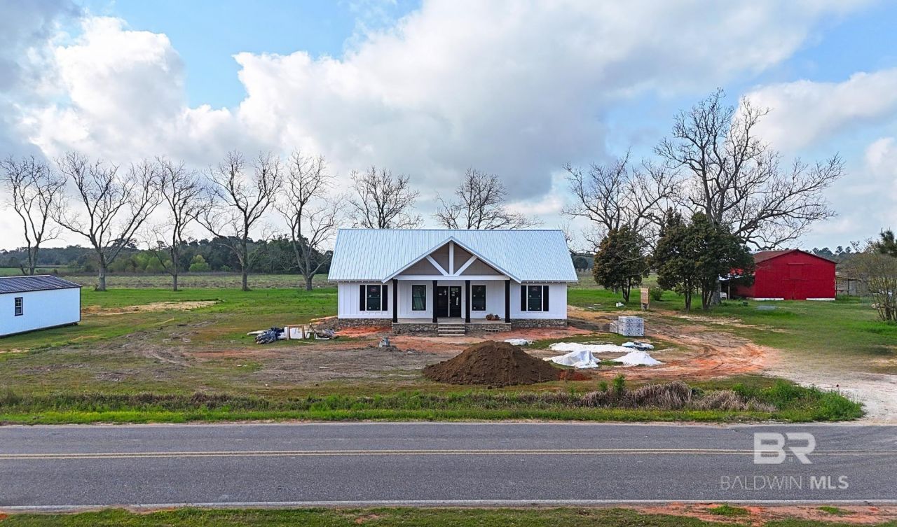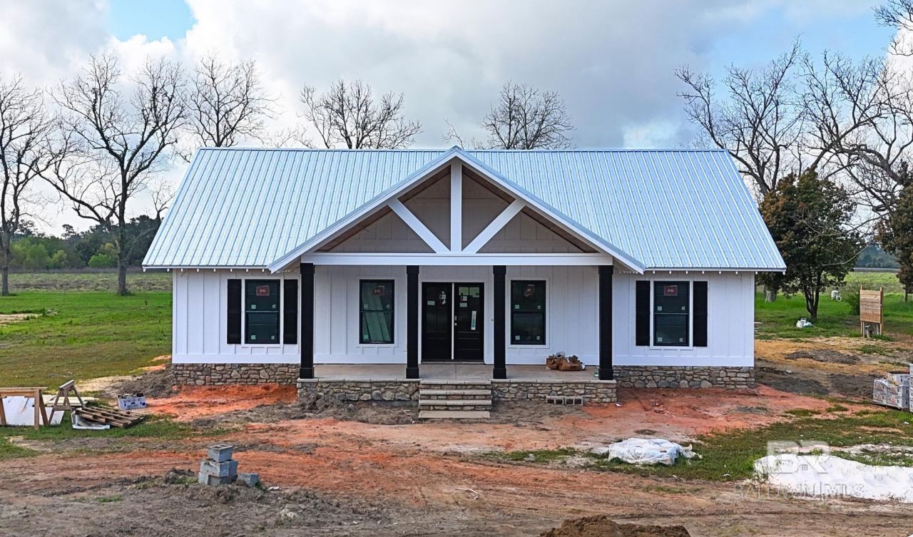Gold Fortified new construction on 1.49 acres with no HOA, featuring a barn with attached chicken coop, mature pecan trees, and flexible outdoor space in a quiet Elberta setting. This 3-bedroom, 2-bath home will be ready in a few months and offers an open-concept layout, 9-foot ceilings, LVP flooring, shaker-style cabinetry, granite countertops, metal roof, tiled primary shower, the kitchen will include a microwave, stove, & dishwasher. Buyers may choose from a selection of optional upgrades available for an additional fee, depending on the stage of construction- available options may include a fireplace and mantel, tongue-and-groove ceilings in the porch and/or living area, tankless water heater, tile in guest bath, glass shower enclosures, and other enhancements. The home will also come with a one-year builder's warranty and a termite bond, giving buyers added confidence and protection. Built to Gold Fortified standards for durability and long-term performance, the home combines modern construction with rural acreage living. Conveniently located in Elberta and near Foley, with easy access to shopping, dining, and Gulf Coast amenities. Contact the agent for more details! Photography/media reflects condition of property at the time of listing* New Photos w/ updated construction progress added 1/21/26! Buyer to verify all information during due diligence.