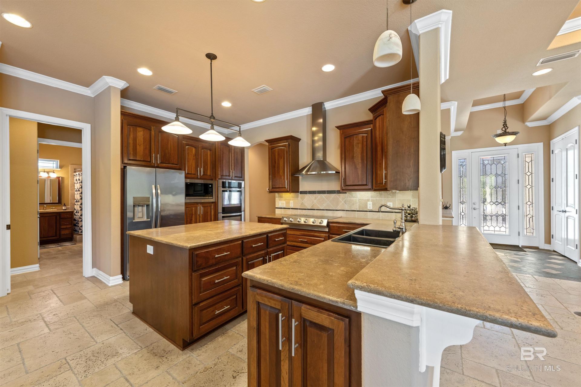 Welcome to a home where luxury meets coastal living on exclusive Ono Island offering privacy, security, and a lifestyle that's second to none.This 5-bedroom, 3-bath residence features a rare and highly desirable layout with three private en suites, ideal for guests, multi-generational living, or added flexibility. Step inside to soaring 10-foot ceilings, elegant tray ceiling details, and a spacious open floor plan designed for effortless entertaining and everyday comfort.The home is loaded with upscale finishes, including travertine flooring throughout, travertine showers, granite countertops and vanity tops, and a beautifully appointed kitchen featuring luxury stainless steel appliances and two oversized 10-foot pantries a true standout for storage and functionality.Enjoy cozy evenings by the two-sided gas fireplace or take movie nights to the next level in your dedicated media room with theater seating and surround sound. Theater seats included to enjoy this one of a kind room on the island.Built for both durability and efficiency, this home includes stucco exterior, impact-resistant windows, doors, and garage doors, along with a fully paid-off 10K solar power system, keeping energy costs low while maximizing long-term value.Outside, you'll find plenty of room to add a private pool, creating your own backyard oasis. The 3-car garage provides ample space for vehicles, storage, or recreational gear including attic storage.Located within the gated community of Ono Island, residents enjoy unmatched safety and security, along with access to community pools, tennis courts and a private boat ramp perfect for embracing the ultimate coastal lifestyle.Opportunities like this where luxury, efficiency, and island living come together?are rare. Don't miss your chance to own a piece of Ono Island. Buyer to verify all information during due diligence.