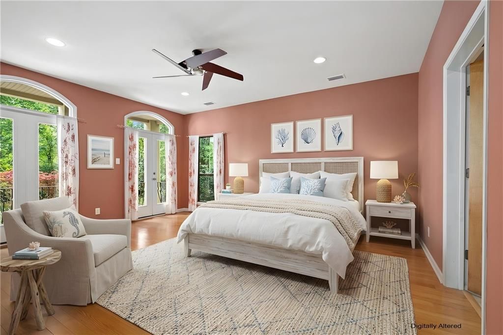 4BR, 4.5 BA private home on 3.22 acres with NO HOA, surrounded by woods for a peaceful, secluded feel just minutes from shopping, dining, and interstate access. Gated entry, long driveway, and 3-car garage with media/flex room ideal for gym, workshop, or hunting/fishing storage. Main level features soaring 20' ceilings, floor-to-ceiling windows, open living/dining area, corner electric fireplace, and screened porch with outdoor kitchen. Spacious kitchen with walk-in pantry, stainless appliances, breakfast bar, and dining area. Primary suite on main level with private porch, spa bath, large walk-in closet, and prayer/meditation room. Upstairs offers 3 bedrooms with large walk-in closets and 2 full baths, plus balcony access. Hardwood floors throughout. Ample outdoor space for gardening, future pool, or more!