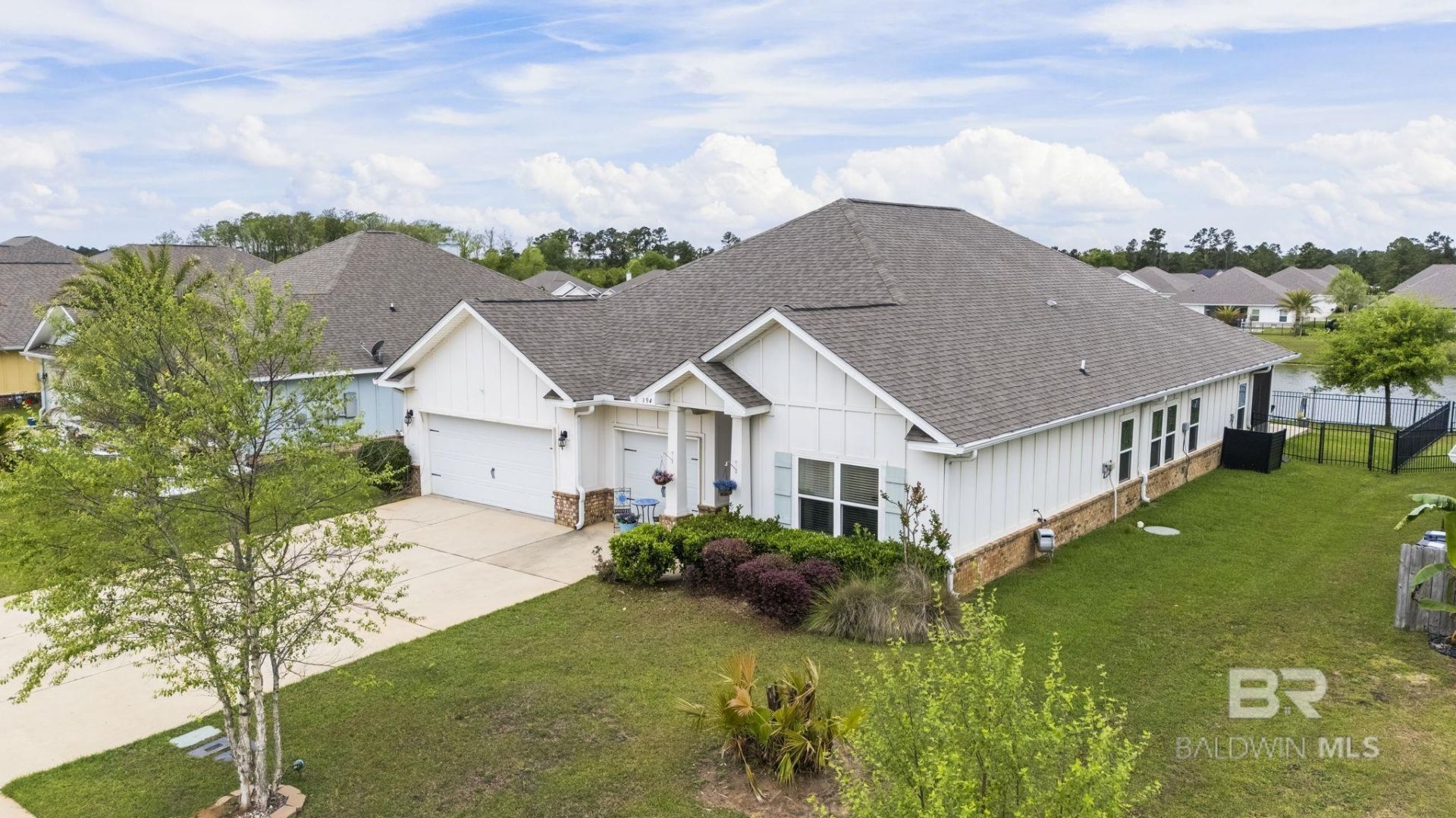 Beautifully designed and thoughtfully laid out, this 4-bedroom, 3-bath home in Aventura subdivision offers 2,795 square feet of comfortable living with a peaceful lake view. Built in 2020 and Gold Fortified, this home combines quality construction, flexibility, and a coastal vibe.The open floor plan creates an inviting main living space that flows beautifully for both daily living and entertaining. You will love the high ceilings and crown molding. One of the standout features is the private mother-in-law suite, complete with its own den, bathroom, and kitchenette. This versatile space is suited for extended family, guests, a private retreat, or even a home office setup. The primary bath has been enhanced with a step-in jacuzzi tub, making it easy to enter, sit, and step out with added comfort and peace of mind. Out back, enjoy the screened porch, large patio and rod iron style fencing overlooking the lake?great for relaxing, entertaining, or simply enjoying the view.Additional features include a 3-car garage, spacious interior, and access to Aventura's beautiful community pool.Very convenienly located near shopping and restaurants and mins to Gulf Shores sugar white beaches. Buyer to verify all information during due diligence.