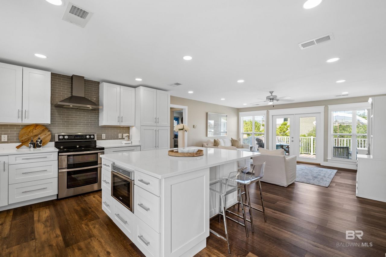 Turnkey Ono Island home with a pool and deeded water access! This beautifully updated property is situated on a spacious corner lot and has been crafted into an outdoor oasis designed with a heated pool and spa, Trex Transcend decking, fenced backyard, covered rear patio, elevated rear porch, electric sunshade, and dense tropical landscaping that provides and abundance of privacy. The backyard connects to a deeded water access that leads to a pristine beach along Bayou St John where you can swim, kayak, paddle board, fish, crab, gig flounder, play in the sand, and lounge. After a day under the sun, you are welcomed by a lovely Fortified Silver home that was fully remodeled in 2019 and boasts two separate living quarters. The ground level living area seamlessly connects to the backyard and offers a spacious living room, over-sized bedroom, dining area, a bathroom with a tiled walk-in shower, full size washer and dryer, and a fully equipped kitchen. The elevated main level houses the master suite, two guest bedrooms, a guest bathroom, and the primary kitchen. The kitchen features a large island with seating for six, under-cabinet lighting, an abundance of storage, and stainless-steel appliances. Throughout the home, you will find COREtec XL luxury vinyl plank floors, wood shaker cabinets with soft close doors and drawers, solid panel doors, recessed lighting on dimmers, Misterio quartz countertops by Vicostone, and a Sonos sound system. The spacious master suite includes a sitting area, double vanity, freestanding tub, tiled walk-in shower, private water closet, and a custom closet with a stack washer and dryer. The guest bathroom is outfitted with a double vanity and a tiled tub/shower. The home also features James Hardie siding, new windows, storm shutters, an outdoor shower, landscape lighting, an irrigation system, storage room, single carport, and a loop driveway with ample room to park multiple vehicles and boats/trailers. Buyer to verify all information during