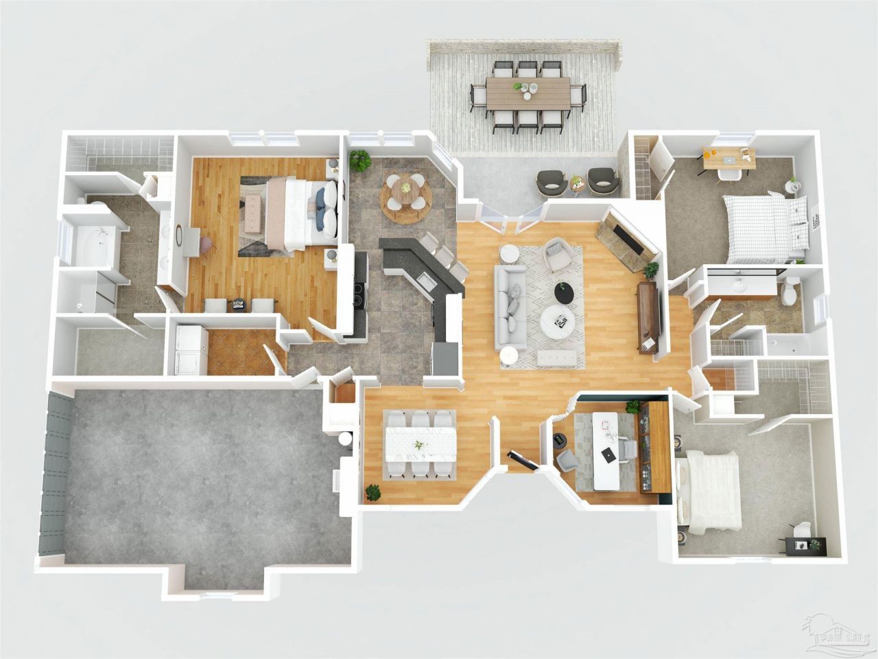 Prime Pace Location ? Modern Custom Brick Home ? Premium Upgrades This home offers a 2020 roof, 2023 HVAC system, open-concept living, and modern finishes in the highly sought-after Windsor Forest community. Thoughtful design, timeless architecture, and quality craftsmanship are complemented by solar panels to enhance energy efficiency and practically eliminate electric costs! A grand arched entry opens to interiors with wood flooring, covered front and rear porches, and versatile living spaces including a family room, formal dining area, and private study. The family room includes a travertine gas fireplace, architectural plant shelves, surround sound wiring, and French doors with built-in blinds providing seamless access to outdoor living areas. Custom window treatments installed in 2025 complete the refined interior. The kitchen is ideal for daily living and entertaining, with quartz countertops, stainless steel appliances, a glass tile backsplash, and custom oak cabinetry. The ultra-spacious split primary suite offers a private retreat with a tray ceiling, dual walk-in closets, and a spa-style bath with marble countertops, garden tub, and separate shower. Outdoor living includes a covered rear porch wired for sound and cable, plus a newly constructed wood deck (2025) overlooking a privacy wall. Additional highlights include an oversized side-entry garage, new driveway gate (2024), newer gutters (2024), extended concrete parking suitable for boats, RVs, and extra vehicles, and a privacy fence with double-door gate. Updated and meticulously maintained, this home provides comfort, efficiency, and long-term value in a desirable Pace location.