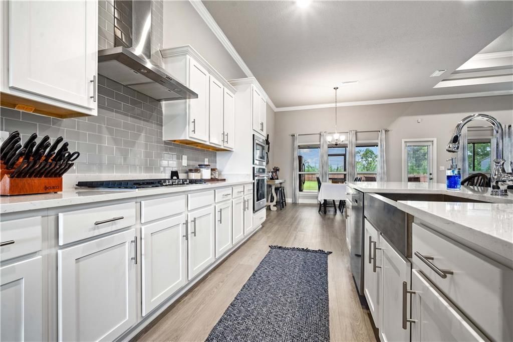 Stunning Kingston floor plan offering approximately 2,997 sq. ft. of thoughtfully designed living space, featuring 4 bedrooms and 3 full baths on nearly an acre of fully fenced land. Located in a USDA-eligible area, qualified buyers may enjoy 100% financing with no money down. The gourmet kitchen is a true showstopper, complete with a large island, quartz countertops, white shaker-style cabinetry, gray subway tile backsplash, stainless steel gas cooktop with vent hood, built-in microwave, dishwasher, and an oversized walk-in pantry. The kitchen opens seamlessly to the spacious living area highlighted by a ventless gas fireplace and direct access to the screened back porch; perfect for relaxing or entertaining. Additional spaces include a formal dining room and a private office/study for added flexibility. Soaring ceilings ranging from 9FT to 13FT enhance the great rooms double trey design, accented by crown molding and ceiling fans throughout. The luxurious primary suite features a trey ceiling and spa-inspired bath with quartz countertops, soaking tub, walk-in tile shower, dual vanities, and an oversized walk-in closet with custom wood shelving. Built to Gold FORTIFIED standards for potential insurance savings, this home also includes an impressive suite of smart-home features: Honeywell Z-Wave programmable thermostat, Kwikset Home Connect smart lock, Deako Smart Switches, touchscreen control panel, Alarm.com video doorbell, Amazon Echo Pop, and more. Recent upgrades include finished wood shelving in all closets and pantry, crown molding in living areas and primary bedroom, tankless gas water heater, gas range, and a screened back porch. A two-car side-entry garage and covered back patio complete this exceptional property. Sellers have also recently poured a 16x24 concrete pad for a future shed and extended both the back patio and driveway, adding even more functionality and value. **Buyer to verify all measurements.**