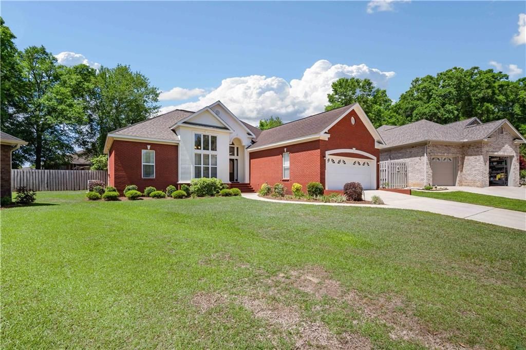 Welcome to this beautifully updated 3-bedroom, 2-bath home located in the Magnolia Grove Legends subdivision at Robert Trent Jones Golf Course! This home features a split floor plan with luxury vinyl plank flooring throughout the living areas and bedrooms, offering both style and durability. The spacious kitchen is equipped with new quartz countertops, stained cabinets, stainless steel appliances, and a cozy breakfast room, making it perfect for both everyday living and entertaining. The formal dining room opens to the large living room, creating an inviting open flow, while 13-foot ceilings and crown molding throughout add elegance and charm. On one side of the home, you'll find two generously sized bedrooms and a full hall bath. Privately situated on the opposite side is the primary suite, complete with a separate sitting area, large walk-in closet, and an updated en suite bath featuring dual vanities, a garden tub, and a custom tiled walk-in shower with glass door. Step outside to enjoy the large fenced backyard, perfectly positioned at the end of a quiet cul-de-sac, offering privacy and plenty of space for outdoor enjoyment. This stunning home combines comfort, style, and location-a must-see in Magnolia Grove Legends!