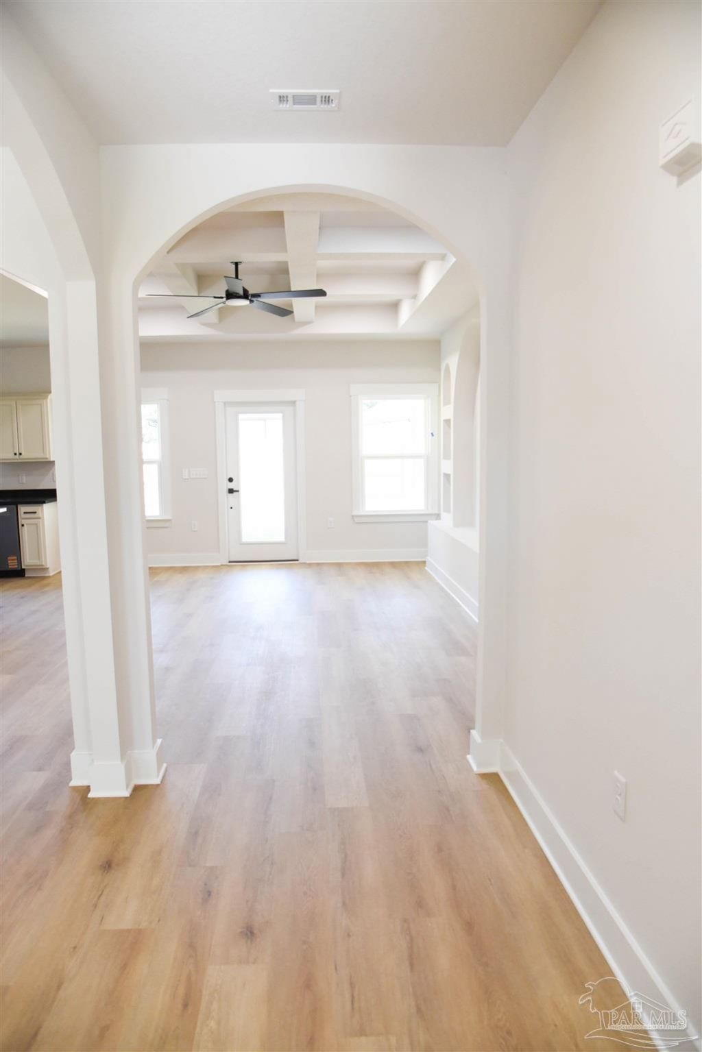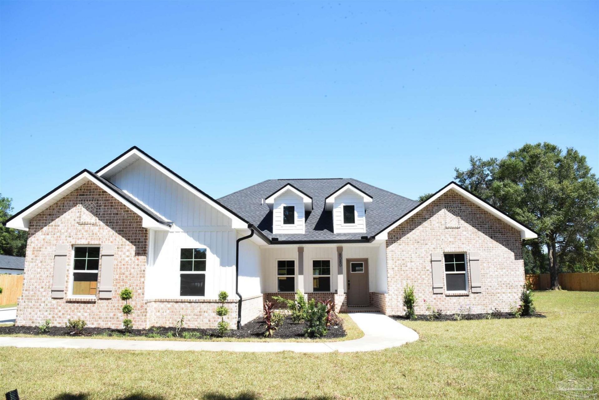 Beautiful NEW CONSTRUCTION in Pensacola! Welcome to this stunning 4-bedroom, 2-bathroom home situated on nearly half an acre (.46 acres) just minutes from the interstate-offering both convenience & quiet. Step inside to discover LVP flooring throughout, arched openings, and a separate dining area. The living room features custom built-ins and a tray ceiling, adding depth and character to the space. The kitchen boasts black quartz countertops and comes fully equipped with refrigerator, stove, microwave, and dishwasher. The master suite includes an additional tray ceiling, tiled shower, and dual vanity for a touch of everyday luxury. Enjoy relaxing or entertaining on the back porch overlooking an expansive fenced yard. With thoughtful design, quality finishes, and a prime location, this home is a real head turner!